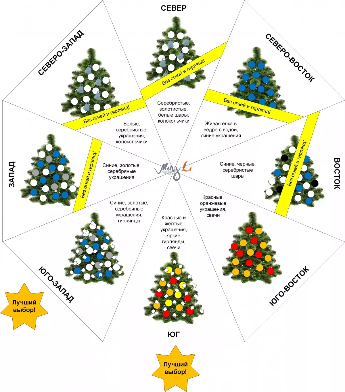 Как выбрать место – поставлено на схеме. Нужный сектор вы находите в своем доме; например, если выбрали юг – ставите ёлочку на юг (или юго-запад) в южной комнате или в южный сектор комнаты с хорошими звездами. Один важный момент: мы сейчас говорим не о секторе по «географии», а о том секторе вашего дома, куда прилетели южные звезды. А они могут отличаться. И эта картинка – до 5 января, потом ситуация меняется.