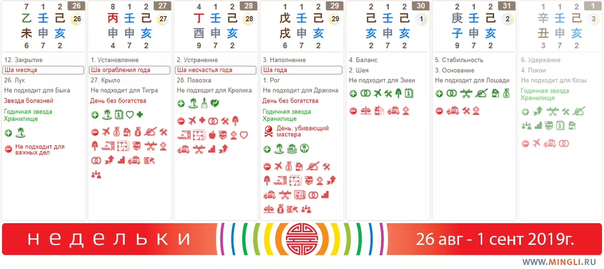 31 августа, суббота. Прекрасный день для “горячих” карт, тех, кому полезны металл и вода. Прогуляйтесь в час Змеи на юг, чтобы найти помощь для своих дел и подтолкнуть карьеру в нужном направлении. Можно гулять со школьниками, кстати, настраиваясь на хорошую учебу. Подходит для любых позитивных дел, только Лошадям (по году) придется провести этот день “в стойле” - для вас он слишком конфликтный.