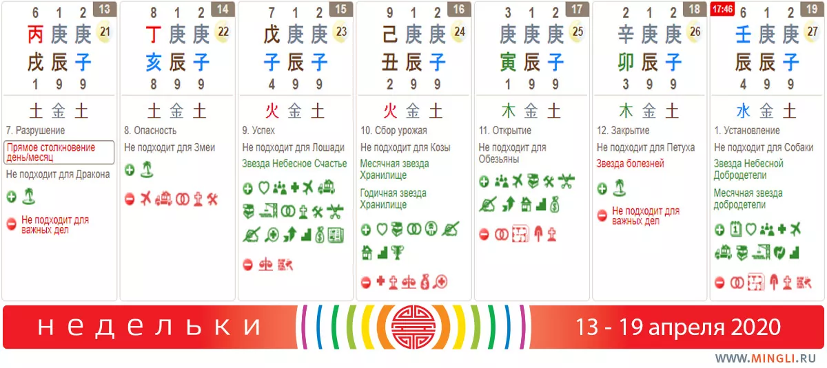 Воскресенье, 19 апреля. День не годится для супер-больших начинаний. Не устраивайте ремонт, похороны, свадьбу, не начинайте новые проекты и бизнес. А вот планирование показано, можно обсуждать, начинать договариваться и намечать новые приоритеты. В час Свиньи на западе можно поставить фонтанчик или поактивничать (гулять также можно). Активизация способствует поиску помощи, развитию карьеры, смене работы. Не подойдет рожденным в год или день Собаки.