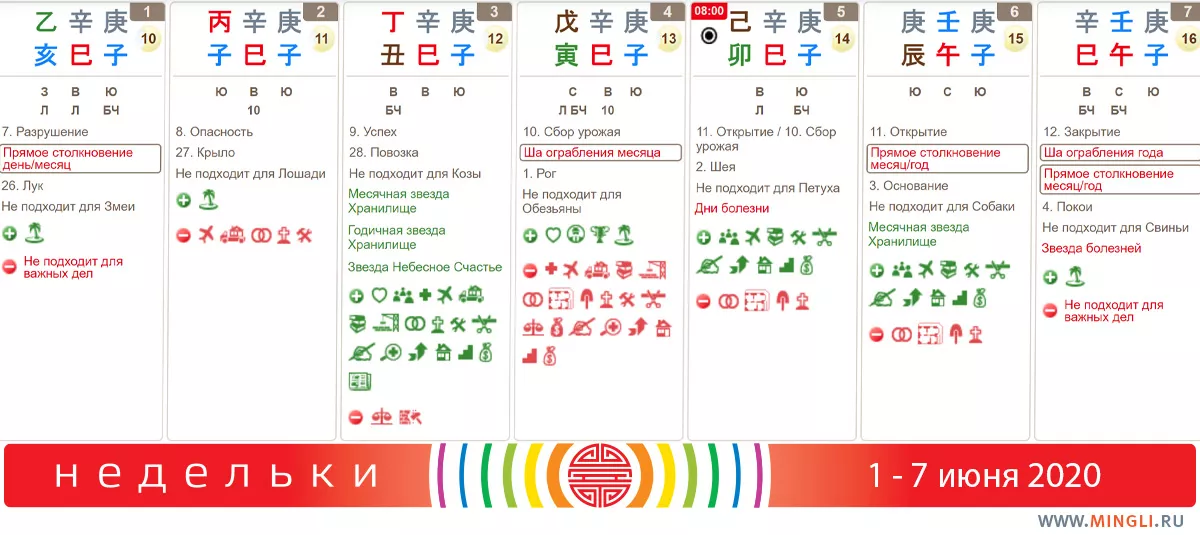 6 июня, суббота. Начиная с этого момента, каждый день будет отмечен надписью “Прямое столкновение месяц-год”. Это не означает, что нужно лечь и не двигаться) Но скорректировать свои планы - стоит. По крайней мере настроиться на то, что если что-то не будет удаваться, вы не будете сильно расстраиваться. Делайте скидки на поведение людей, так как те, кого затрагивает это столкновение (Крыса-Лошадь) могут весь месяц вести себя не так как раньше, да и, честно говоря - не вполне адекватно. В меньшей степени это касается также и тех, у кого просто есть Лошадь или Крыса в карте бацзы. Серьезные перестановки или активизации также в июне планировать не стоит.