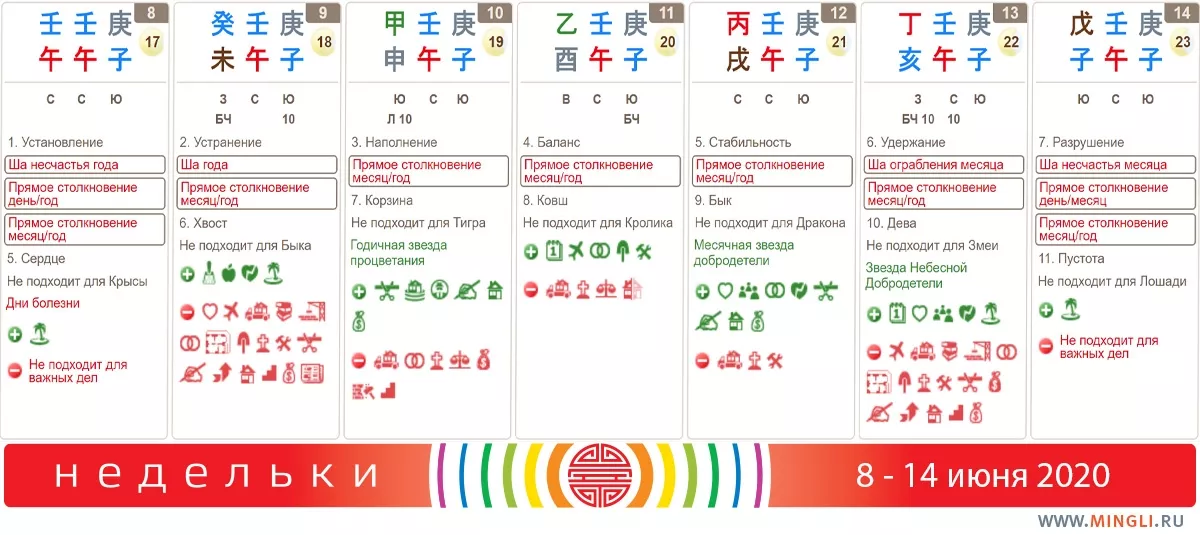 9 июня, вторник. Подходит для уборки, начала диеты. Но можно столкнуться с задержками и замедлениями. Не подходит для важных дел, если Иньская Вода - ваш Полезный Бог. В час Обезьяны поставьте на юго-востоке вентилятор или фонтан на два часа - такая активизация подойдет для налаживания стабильного состояния всех сфер жизни, но для рожденных в год или день Быка она не подходит.