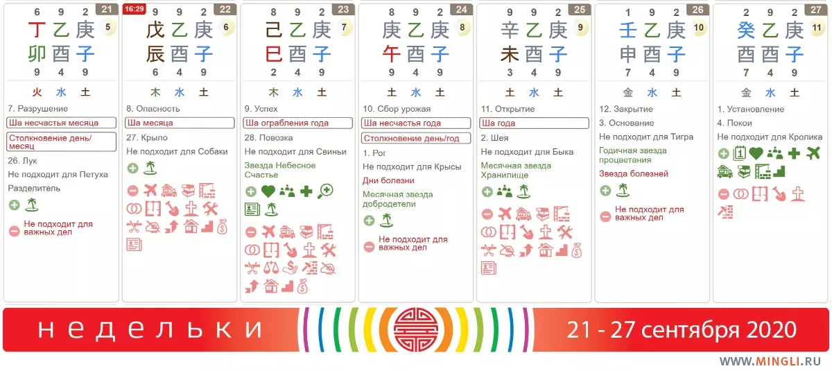 21 сентября, понедельник. Так себе денек в плане потенциала. Сегодня не рекомендуются действия, связанные с отношениями людей: свидания, помолвки, перестановки кроватей, подписание брачных контрактов, так как в результате люди могут расстаться. Постарайтесь также свести до минимума всяческие экстремальные и опасные мероприятия, а то и вовсе отменить их, так как день довольно травмоопасен. Особенно, если у вас есть парочка Кролик-Петух в карте.