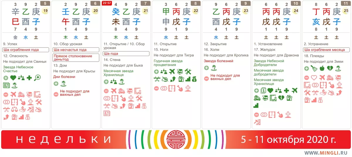 10 октября, суббота. Если вы оцениваете дни в календаре по принципу зелененький/красненький - то он выглядит симпатично. Однако, опять имеется подводный камешек, даже два: дубликат дня к месяцу. Поэтому посмотрите на свою карту бацзы, нет ли там столпа (2 иероглифов) Бин Сюй, то есть Янского Огня на Собаке. А дальше проверяйте: если такой столп есть в году - бережно отнеситесь к здоровью и родителям, в месяце - к работе и близким родственникам, вы сами - Бин Сюй по дню - опять-таки на первый план выходит здоровье и отношения, ну и час - вопросы детей. В субботу лучше умерить активность, не экстремальничать, не принимать важных решений, особенно если огонь и земля не полезны. Посвятите день духовным практикам (особенно прощения и благодарности) и неспешным беседам с друзьями. Практики лучше проводить на юго-востоке в час Петуха.