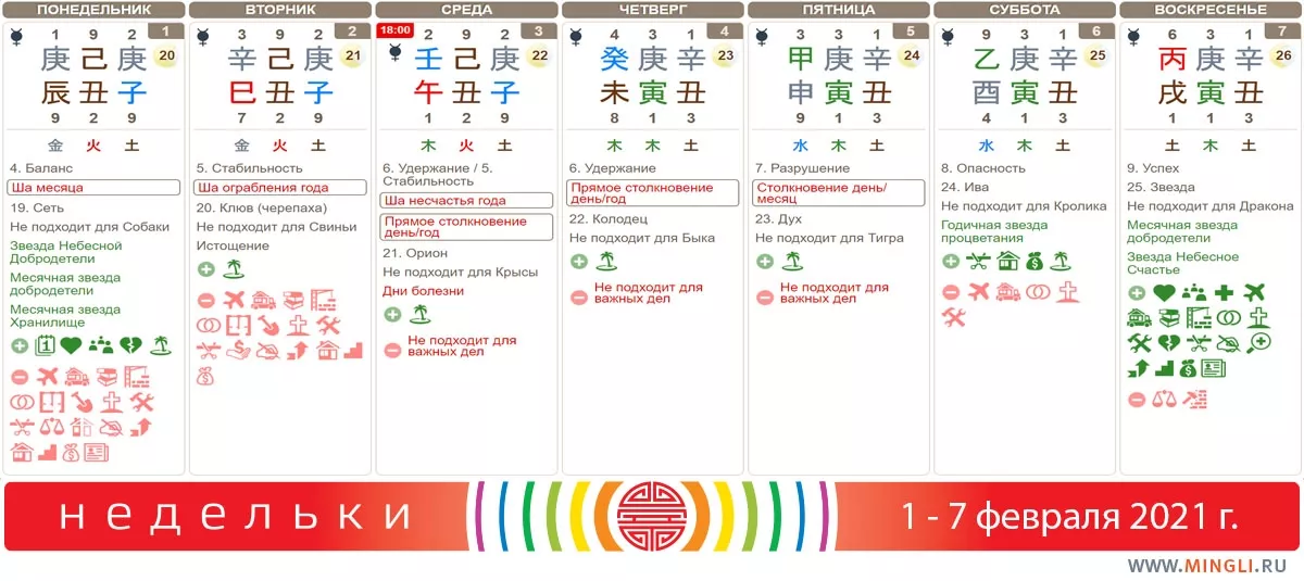 6 февраля, суббота. В дне присутствуют благородные звезды, и они очень благоприятны для свадьбы, строительства, начинания бизнеса и проектов, переезда в новый дом. Действия в этот день приносят процветание потомкам и много счастья. Так что если вы не хотите дожидаться окончания периода ретроградного Меркурия, то день подходящий. “Хвост” травмоопасности тянется и сюда; Иньским Деревьям и Огням (любым) лучше не заниматься экстремальными видами спорта.