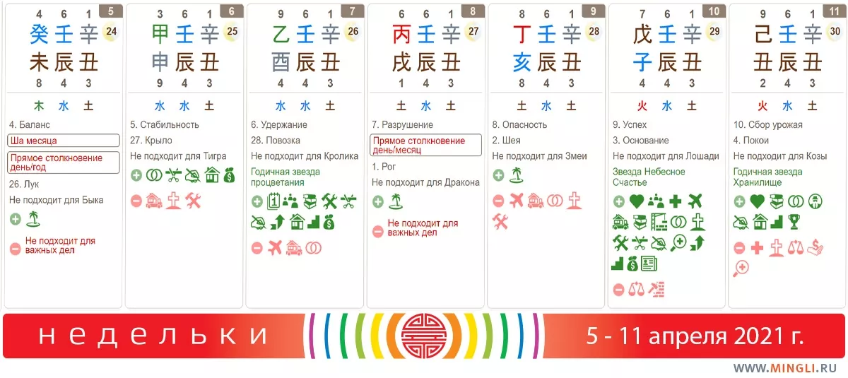 7 апреля, среда. Тоже приятный денек. На этот раз тихо вести себя стоит Кроликам, Иньским Деревьям, а Огням по-прежнему показана профилактика и здоровый образ жизни. День благоприятен для ремонта, переезда в новый дом, свадьбы, начала бизнеса и проектов и путешествий. Так что практически ни в чем себе не отказывайте) Очень хорошо заниматься любыми финансовыми делами (всем, кроме рожденных в день Металла).