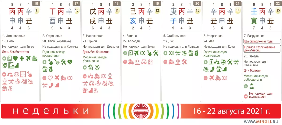 16 августа, понедельник. Сразу начинаем с дня - дубликата к месяцу. Видите одинаковые столпы? Кому надо обратить на день внимание? В первую очередь, тем, у кого в карте бацзы есть такой же столп (Янский Огонь на Обезьяне) или же есть Янский Огонь на Тигре. Если Огонь вам не полезен - внимание удваиваем. Особенно, в час Обезьяны. Что это означает? Постарайтесь думать, прежде чем делать, не принимайте важных решений, не совершайте супер-важных дел и осторожнее ведите себя в ситуациях, где возможна травма. Огням или Землям по дню рождения стоит беречь здоровье.