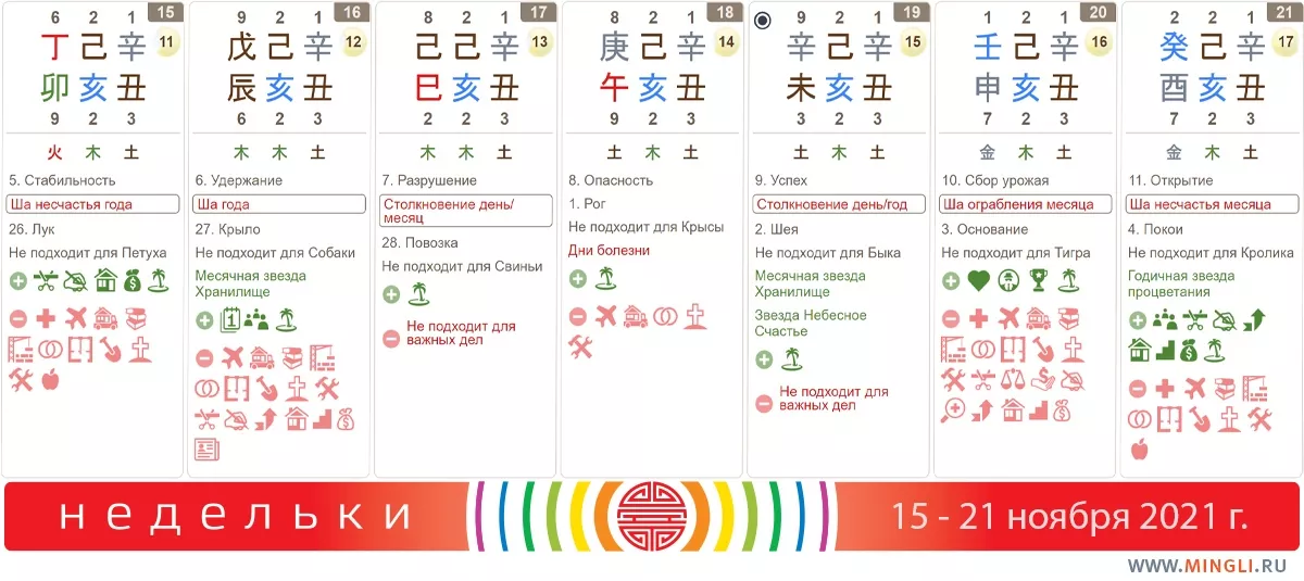 15 ноября, понедельник. Неплохой день, особенно он хорош для тех, кому полезна цепочка Дерево-Огонь. Годится для бизнес-дел, новых начинаний, манипуляций с деньгами. Не подходит для начала лечения и экстремального спорта.