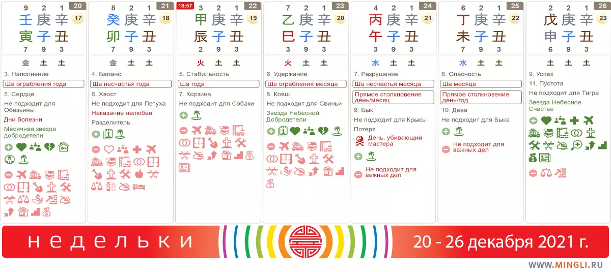 26 декабря, воскресенье. Отличный день! Ци благоприятная, много благородных звезд, поэтому день хорош для большинства мероприятий, так как это принесет богатство, рождение прекрасного сына, удаление препятствий в делах. Так что ставьте елочку, если еще не поставили, встречайтесь с друзьями и готовьтесь к Новому году!
