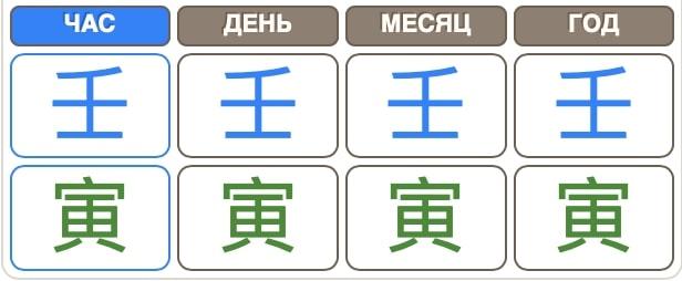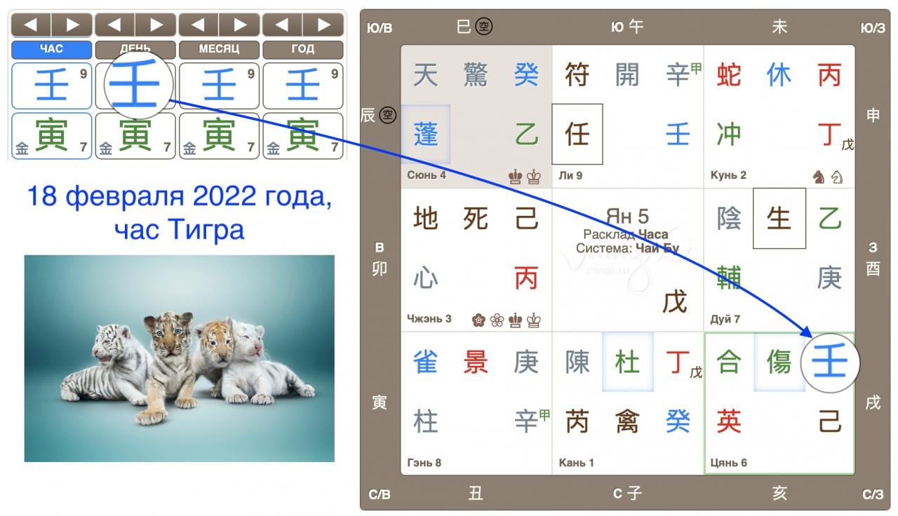 Февраль 2022 года – необычный месяц, это дубль года. Ожидается, что водный Тигр стремительно впрыгнет в нашу жизнь и сразу наведет в ней «шороха». Особенно для тех, у кого в карте Ба Цзы есть для этого предпосылки. Более того, внутри февраля «припрятано» особое времечко - дни Тигра, один из таких дней, заслуживает более пристального внимания. Запишем дату 18 февраля 2022 года с помощью иероглифов, для полноты картины используем час Тигра этого дня. Полюбуйтесь на красоту!