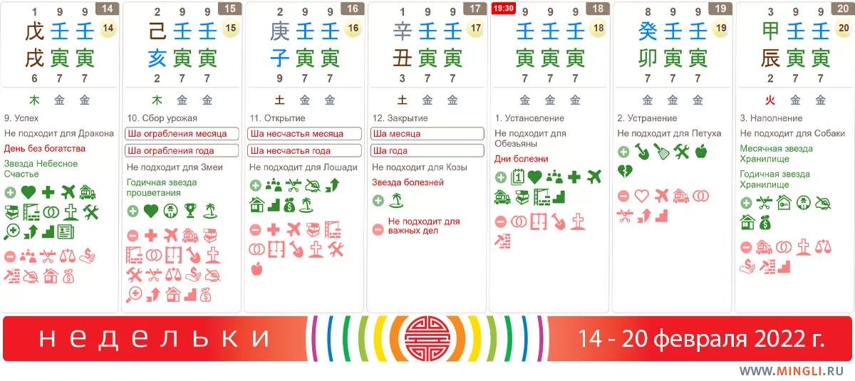 14 февраля, понедельник. Отличился тем, что при всех прочих прекрасных показателях умудрился оказаться Днем без Богатства. Поэтому не планируем мероприятия, так или иначе связанные с финансами: открытие бизнеса, подписание договоров, кредиты, крупные покупки. Для ремонта или строительства также не подходит. 14-е февраля в конце концов – лучше сходить на свидание, а, может, даже предложение сделать). Если пойдете на свидание в час Петуха – отправляйтесь на юго-восток от места работы или дома, где проводили время, если попозже, в час Собаки, то на запад.