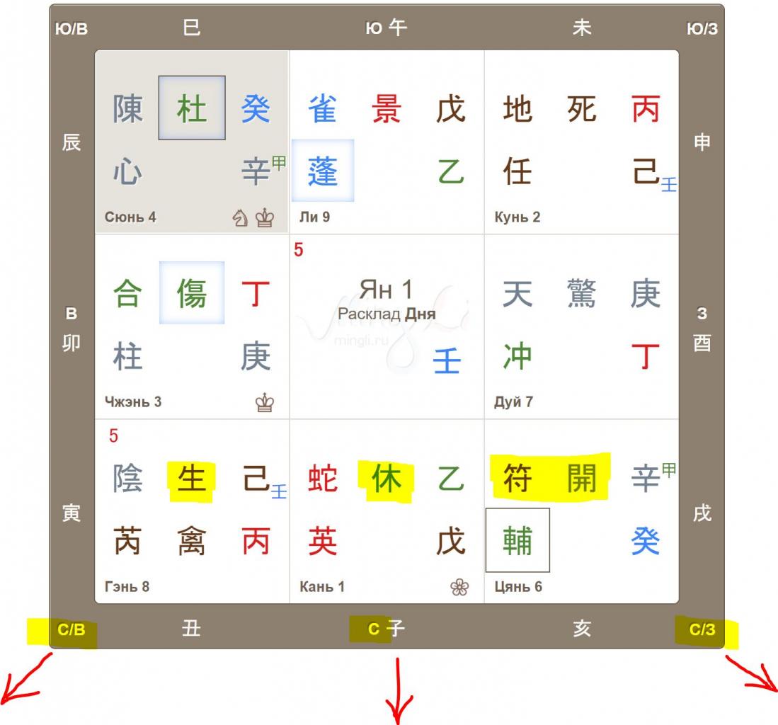 Если вам все понятно, можете посмотреть также, чтобы врата не были разрушены (есть в описании дворца) и выбирать то направление, в котором есть Джи Фу 符 или Мистики 丁丙 или 乙. И время выбирайте местное солнечное в своем городе.