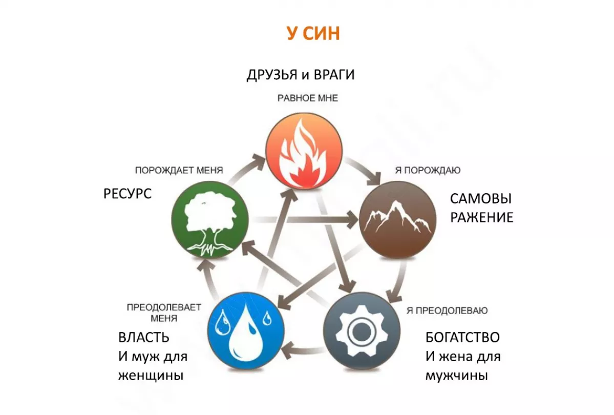 Помните, мы говорили о 5 стихиях, из которых состоит карта Бацзы? Если посмотреть на человека, на Господина дня, то такая же стихия, как он сам, будет представлять его друзей или конкурентов. А остальные стихии – другие аспекты жизни: самовыражение, богатство, власть и ресурс. Кстати, вы знаете, что в зависимости от того, какие аспекты жизни есть в карте, можно выяснить, к какому типу личности человек относится: к социальному, творческому, властному,