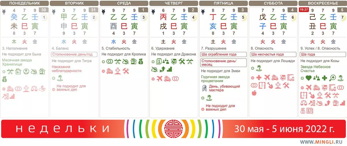 Нас ждет последняя неделя мая, месяца Змеи. Ждет нас «горячий» месяц Лошади, Бин У, Огонь на Огне. Уже с 23 мая вы могли почувствовать первое влияние Лошади, а со 2 июня может вызывать события уже и янский Огонь. Если для вашей карты бацзы Огонь неблагоприятен – поставьте важные дела на паузу, не принимайте судьбоносных или спонтанных решений. Подробнее об июне вы можете почитать в прогнозе в нашем Блоге, а также послушать эфиры в Телеграм – о самом месяце и о здоровье. Ремонт и земляные работы можно начинать в понедельник, среду и четверг. 3 июня закончится ретроградный Меркурий, и если, напротив, Огонь является полезным элементом вашей карты бацзы – потерпите последнюю недельку и два следующих месяца сможете идти на прорыв).