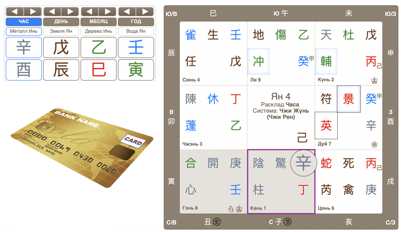 Помня правила чтения расклада о потерянных вещах, обнаружила, что Банковская карта – Небесный ствол часа Синь во дворце Кань, а там Пустота (серый квадрат в раскладе).