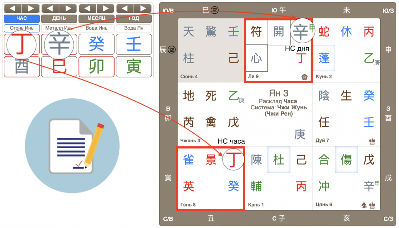 Проверяю наполнение дворцов Ли и Гэнь, куда опустились соответственно Человек – Небесный ствол дня Синь и Дело – Небесный ствол часа . Дворец огня Ли порождает дворец почвы Гэнь, Человек порождает Дело . Это указание на возможность благоприятного исхода.