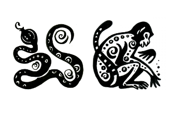 Пятая пара – это Змея и Обезьяна. Змея представляет одиночество, которое всегда нужно тому, кто хочет выразить свою индивидуальность. А Обезьяна представляет столь же важную черту – быть частью сообщества. У каждого из нас есть собственная история жизни и свои цели, которые важно определить для себя. Но между тем людям нужно работать вместе, участвуя в общем деле в силу своих возможностей – для достижения общего блага в целом.
