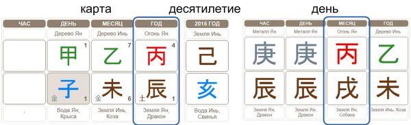 2. Дни, когда вы видите сверху такой же иероглиф как у вас в карте или такте, а внизу тот, который сталкивается с вашей картой.  В примере в карте стоит Янский Огонь на Драконе, а в дне (в месячном столпе) – Янский Огонь на Собаке. Собака и Дракон сталкиваются.