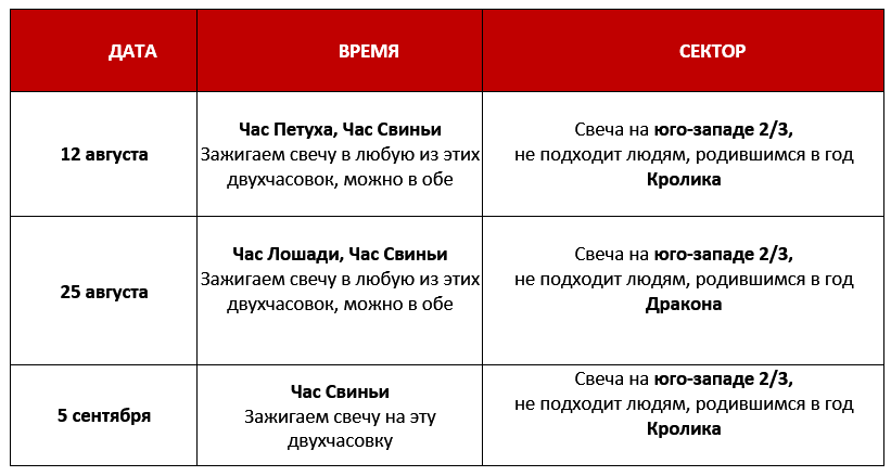 С хорошими датами в августе очень не просто, но жизнь не останавливается, дела делать нужно, если у вас нет другого выбора, то постарайтесь исключить даты, которые непосредственно оказывают влияние на вашу карту Бацзы. Ну, например, «огненное наказание» может вообще вас никак не затронуть – у вас нет Змеи ни в карте, ни в такте, и Огонь полезен. Но учитывайте, что в решении важных вопросов участвуют и другие люди, а вот их то как раз и может затронуть. Поэтому для важных дел хорошо иметь запасной план.