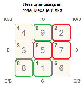 В центре происходит удвоение «пятерки», эта комбинация задает тон характеру месяца, и это еще одно подтверждение резких, неожиданных событий. Центр дома не корректируется, но постарайтесь чтобы в центре дома не было красных предметов, много свечей, постоянной активности.