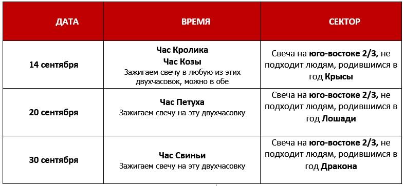 Можно это сделать 10 сентября в час Лошади, не подходит для тех, кто родился в год Обезьяны. Или 14 сентября в час Лошади, не подходит для тех, кто родился в год Крысы.
