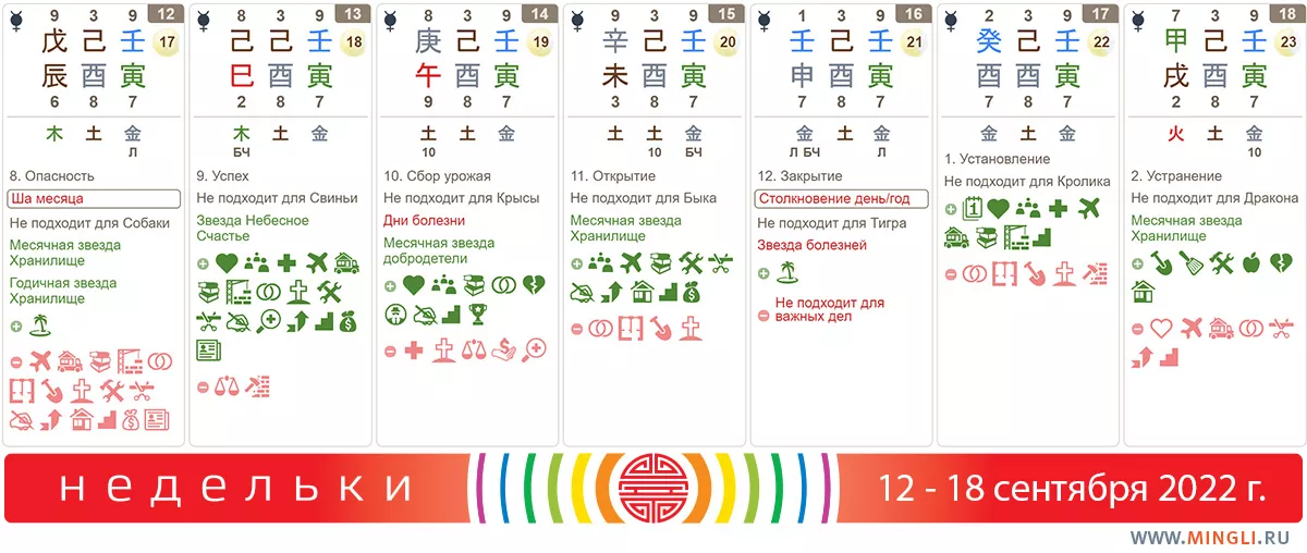 13 сентября, вторник. Отличный день (только не для Свинок по году рождения)! В нем присутствует много благородных звезд. Он очень благоприятен для свадьбы, переезда в новый дом, строительства, земляных работ, начинания бизнеса и проектов, путешествий, а также большинства позитивных дел, особенно если вам благоприятны Земля и Металл.