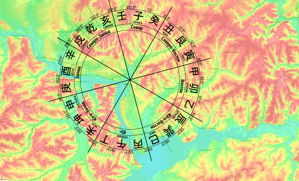 На этой карте мы видим 2 важных и самых сильных по влиянию водных рта для города. Слияния рек дают очень сильную турбулентную ци – это большая активность.