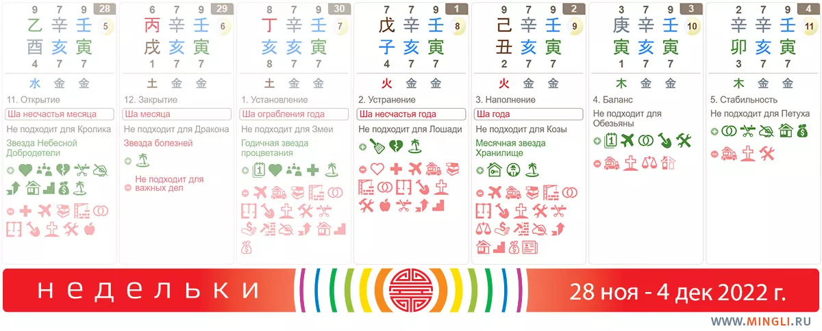 28 ноября, понедельник. День является очень благоприятным, но с парой нюансов – не стоит начинать ремонт или лечение, проводить земляные работы, ссориться с лицами противоположного пола. В остальном он подходит для свадьбы, переезда в новый дом, начинания бизнеса и проектов. Дела, сделанные в этот день, приносят рост собственности, признание и вознаграждение от работы, хорошую репутацию. Хорошие служащие придут устраиваться на работу, не будет никаких препятствий. Можно мириться, договариваться. Иньским Деревьям, а также Огням, особенно слабым, стоит поберечь здоровье.