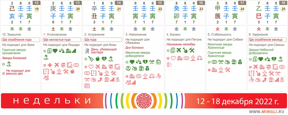13 декабря, вторник. Годится для планирования, встреч, переговоров, но важные решения принимать не стоит, как и для значительных дел день не годится. Кроме того, день травмоопасен, особенно для тех, у кого в карте есть Лошадь. Янским Металлам стоит позаботиться о здоровье.