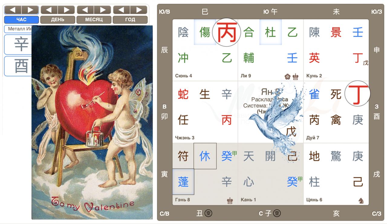 Когда же в этот день встреча ищущих сердец наиболее вероятна? Для этого пробуем найти час, в котором наши фигуранты очень заметны. Та-дамс! Есть в дне такой час! Расклад часа Петуха, в котором симпатичный丙 и трепетная опустились в те же дома, что и в раскладе дня, а значит выделяются, подпитываются фоном дня. Час Петуха активно способствует пересечению «случайных взглядов».
