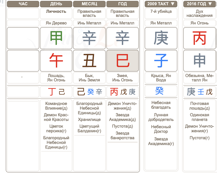 А мне еще нужно разорвать треугольник металла. Чем можно это сделать? Много воды добавить или много огня? У дочки в карте змея(час)+тигр(день)+бык(в пустоте)+петух(год). Ей сейчас 17 (инвалидность по речи - потеря речи в 3 года), годовой столб вверху дерево инь - грабитель богатства ее дневного дерева цзя. Внизу металл - петух. В дни, месяцы и годы быка - просто караул - наработанные навыки слетают все, хотя бык - благородный. Сейчас спасает более менее "история" - ей очень нравится учиться и именно история - читаем историю - болезнь отступает. История - это же земля, наверное, или вода? Еще было улучшение в год крысы - значительное. Крыса - это благородный и она вода. Всякие шарфы синего и красного цвета - не помогают. Сама она дерево цзя. Бедное деревце просто атаковал этот металл. Слияние вверху с матерью плюс контроль (это еще тот ужас). (((( Вверху металла нет. Я вроде немного разбираюсь уже. Хотела у вас поучиться, но не хочется прям с начала - вот если бы вы сделали возможность покупать уроки. Разделили бы по урокам и выделили бы стоимость одного урока, а у вас даже требования - учиться сначала. А вообще у моей дочки такая интересная карта, можно ее разобрать? К тому же и час тоже известен.