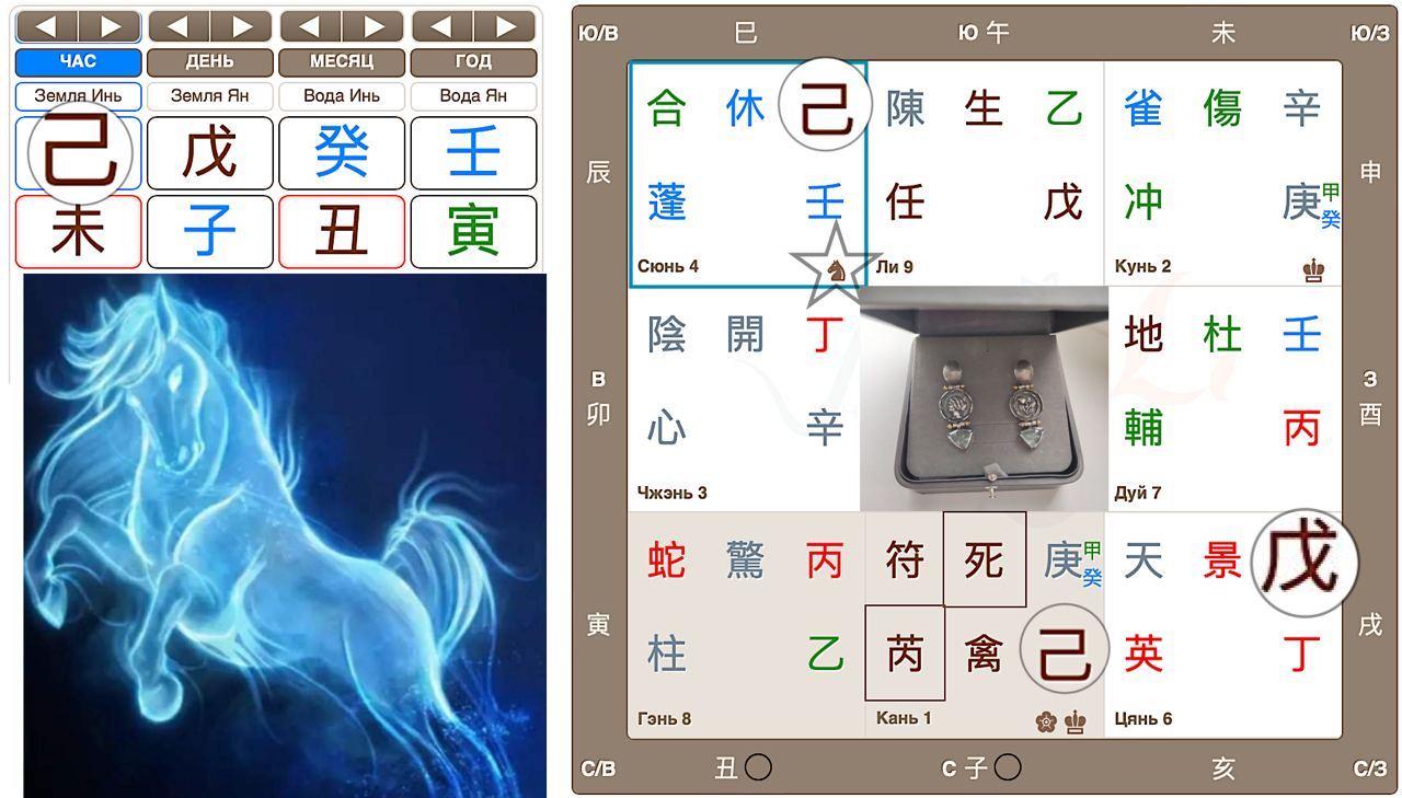 Открыла и расстроилась: потеряшка Небесный ствол часа попала на внутреннее кольцо расклада, а вопрошающий Небесный ствол дня – на внешнее. Во дворце с часом знак Путешествующей Лошади (выделен в раскладе), что запросто может означать, что вещь утеряна в движении. Серьги любимые, изготовлены на заказ. Наверняка многие знают, что украшения цимэниста – это больше чем украшения, это еще и инструмент для достижения результата, даже волшебная палочка, если хотите 😊. Мысленно я уже прикидывала вероятную стоимость восстановления изделия, когда меня осенила мысль: «Так-так! Путешествующая лошадь во дворце с потеряшкой!». А ведь это может означать и то, что она двигается вместе со мной!