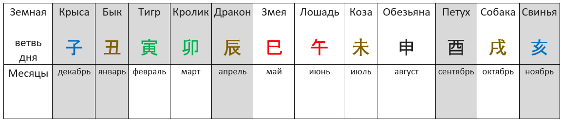 Сведем воедино то, что у нас получилось. Серым фоном отмечены неблагоприятные дни и месяцы.