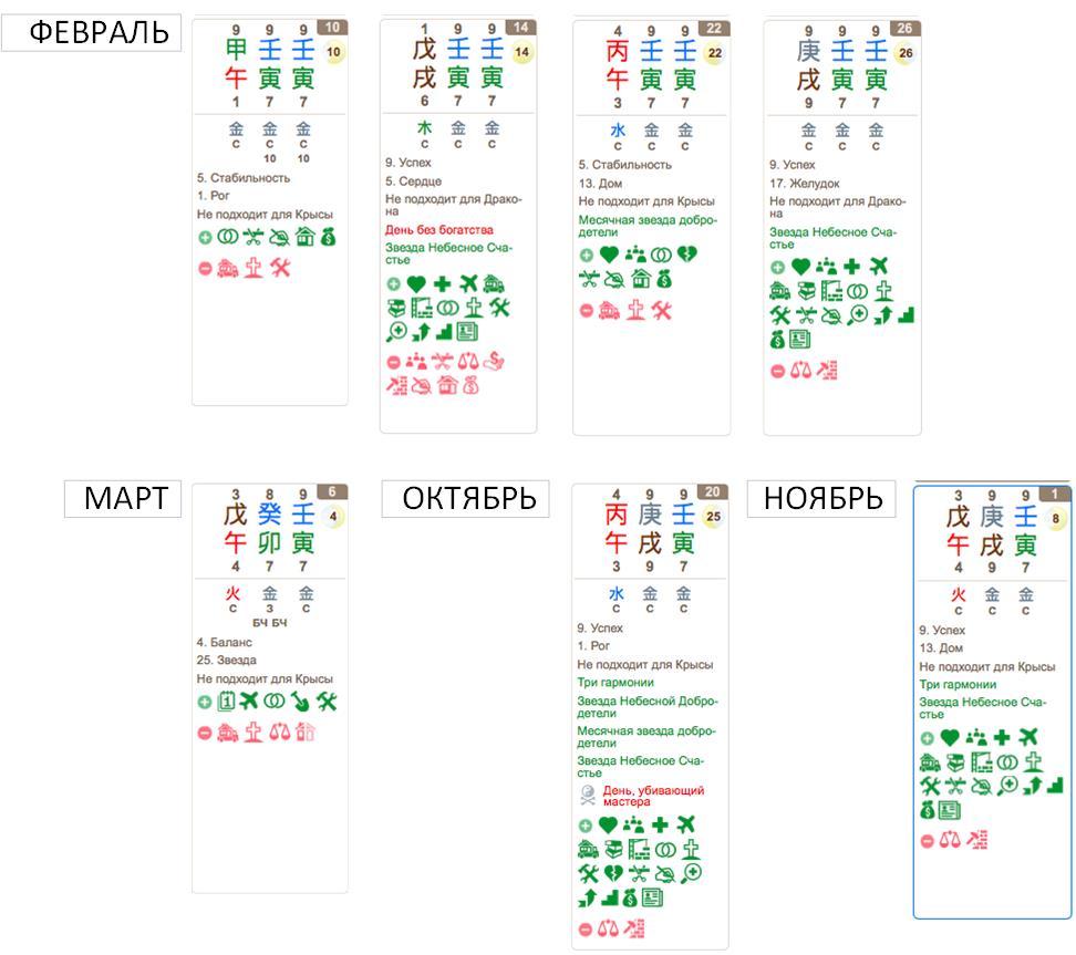 4. Ищем звезду заклятия Болезни. В такие дни и месяцы лечение, обследования и процедуры не будут иметь успеха, диагноз может быть поставлен неточно, а обследования, лечение и процедуры будут не столь эффективны. Соответственно, исключаем все дни Быка – Чоу и месяц январь, и все дни Дракона – Чэнь и месяц апрель.