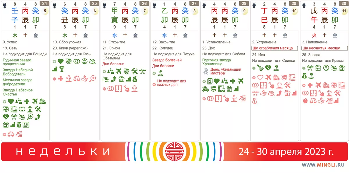 24 апреля, понедельник. Хороший день, хотя ци в нем маловато. Зато присутствуют благородные помощники, поэтому если вам обязательно надо запустить какой-то проект, и до начала ретро Меркурия вы не успели это сделать, а ждать не намерены – можно воспользоваться сегодняшним днем. Если вода вам благоприятна – очень хорошо. День также подойдет для переговоров, общения, примирения.