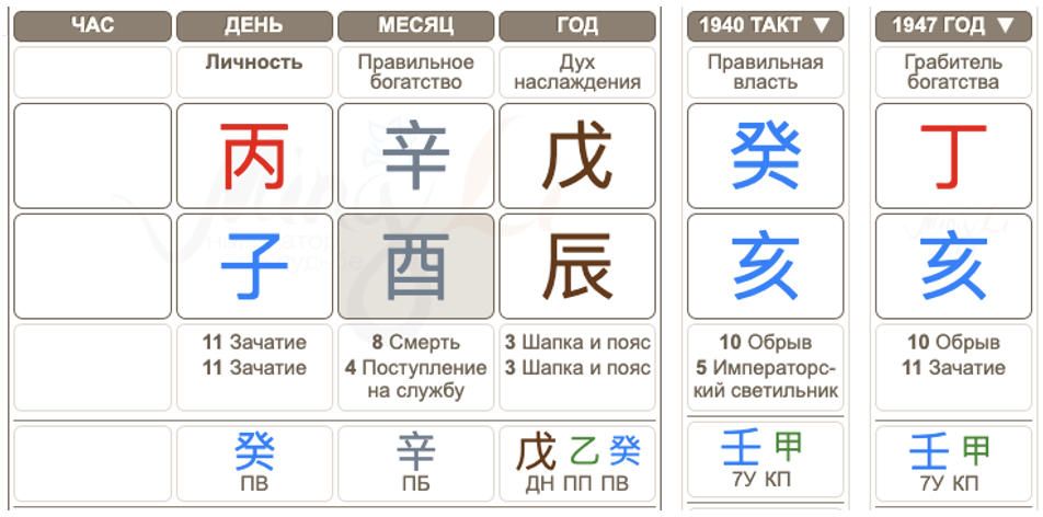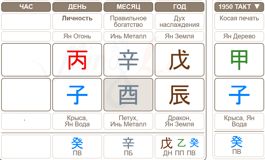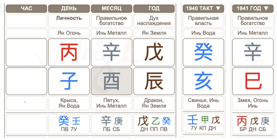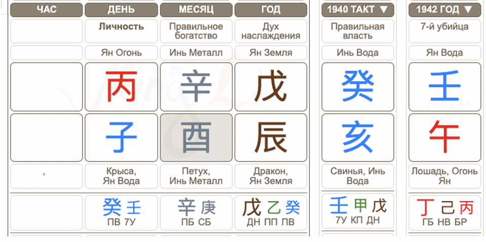 В Бацзы есть такая техника, как чтение по столпам, и эту информацию мы используем в статье как для чтения карты, так и для понимания периодов. Столп иньского Металла на Петухе для человека янского Огня говорит о его трудолюбии, умении управлять финансами. Такой человек может много времени уделять работе и карьере. А столп года рождения Валентина Ивановича, янская Земля на Драконе, намекает нам, что у человека Огня в таком случае будет покладистый характер, в детстве он получает любовь от родных.