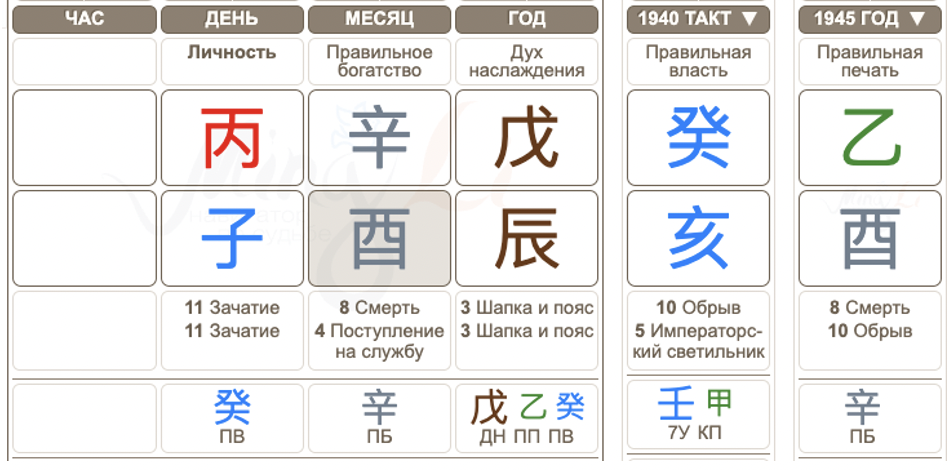 В 1945 в небесном стволе года приходит элемент Ресурса – Валентин Иванович хотел продолжить учебу, но хотя официальная дата окончания войны значится как 9 мая, боевые действия еще шли долго, и службу пришлось продолжить. Увы, Ресурс на низкой фазе ци – Обрыв. Да еще и столкновение иньского Дерева с иньским Металлом в карте.