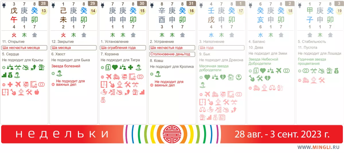 30 августа, среда. Плохой денек для важных решений, финансовых дел, начала поездки. Сегодня дубликат месяца, поэтому если Металл вам не благоприятен или в карте Бацзы есть металлическая Обезьяна или деревянный Тигр, лучше заниматься повседневными делами и особо не активничать. Будьте осторожны за рулем, во время занятий спортом и при взаимодействии с другими – кто ж знает, что там у них в картах Бацзы.