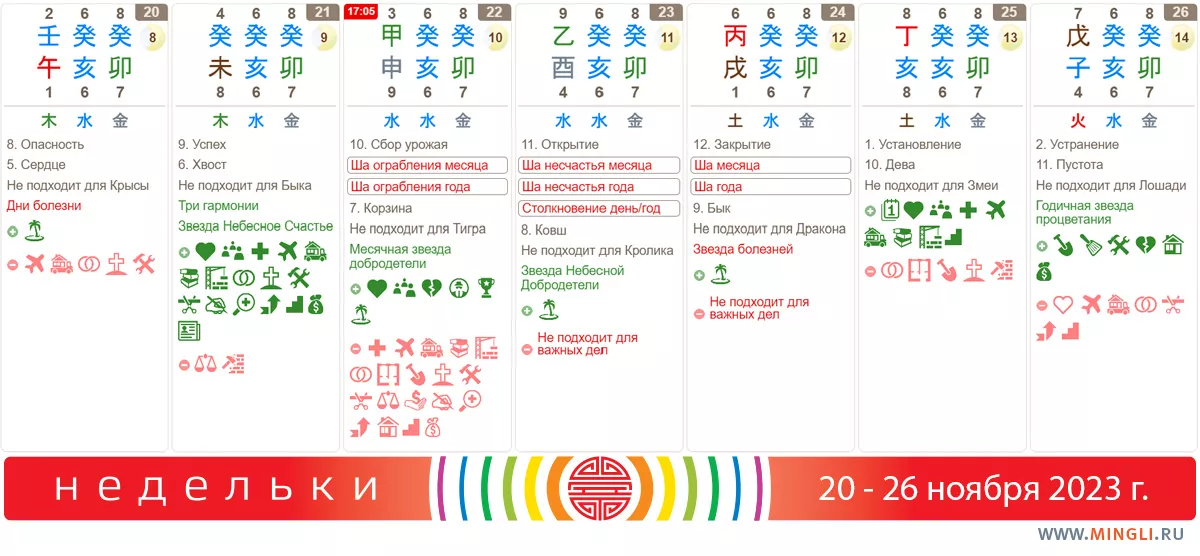 21 ноября, вторник. Чрезвычайно благоприятный день, поддерживаемый благородными звездами. Он очень хорош для строительства, свадьбы, путешествия, переговоров, общения. На пути будут встречаться благородные помощники, в доме будет мир и поддержка в течение 100 дней. Также он приводит к увеличению собственности, рождению прекрасного сына и хорошей удаче семьи. В общем, действуйте, если вы не Бык по году! Особенно если Вода полезна.