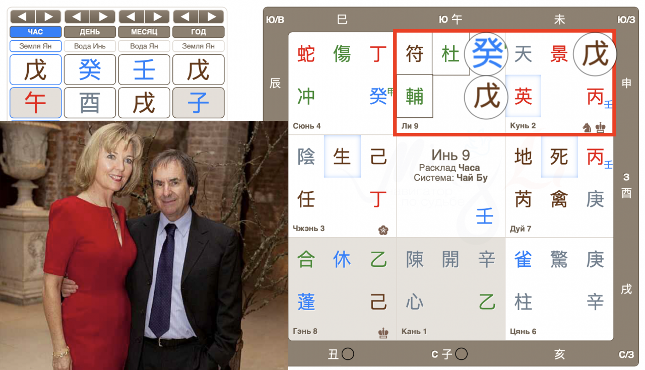 Крис де Бург родился в день 癸 иньской Воды, в раскладе его ствол рождения опустился в дом Ли. Видный человек, не чужд романтики – 辅. Его метафизическая «пара» – ствол в его же доме Жизни на земной тарелке. Это очень показательный момент, у певца тесная связь со своей половинкой. Конечно же, такой человек может посвятить свое творчество жене. Но, тем не менее, у половинки есть и свое место в раскладе – дом Кунь.