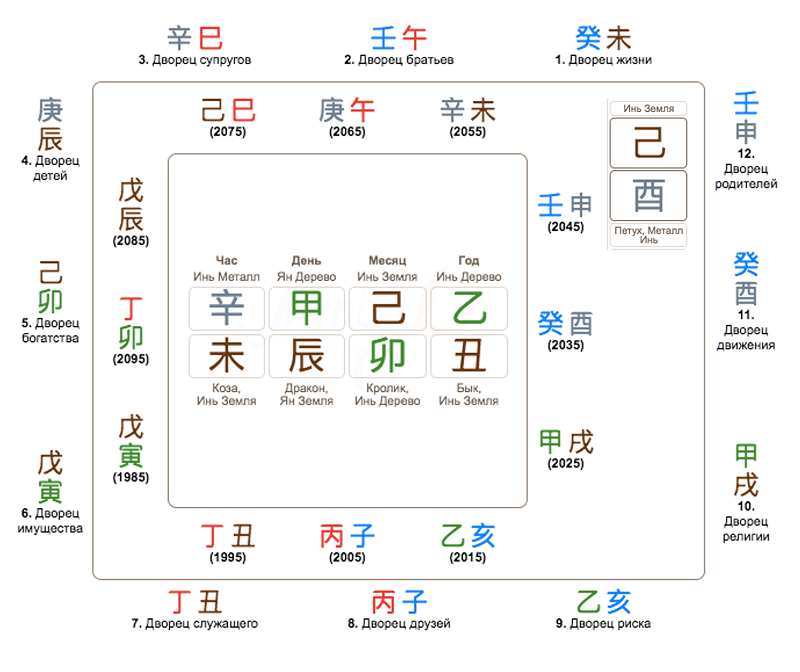 Можем также посмотреть такой показатель, как «малая граница» (он дает нам указание на внешние обстоятельства). Отсчет здесь ведется от Дворца Жизни. И у нашего мужчины в 2019 году малой границей был столп иньской Земли на Петухе 己酉: Правильное Богатство на Правильной Власти. Большая загруженность по работе, перенапряжение истощают и слабое по бацзы здоровье. Но люди, рожденные в день янского Дерева на Драконе часто упрямы и настойчивы, особенно рожденные в сезон Дерева. И человек готов пахать и пахать, не обращая внимания на тревожные сигналы своего организма.