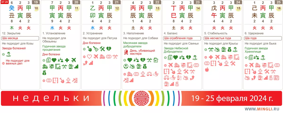 21 февраля, среда. Еще один «деревянный» денек. Если Дерево полезно – отлично, а нет – так лучше провести день в привычных заботах. Неблагоприятен для строительства и свадеб – принесет вред старшим членам семьи в течение 60 дней и судебные иски в течение 3-5 лет (Это вам немного из китайцев 😉). Зато очень хорошо от чего-то избавляться: от мусора и лишних вещей, до вредных привычек.