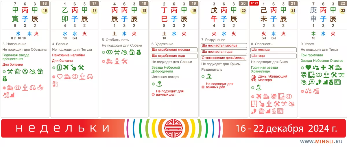 19 декабря, четверг. После череды неплохих дней можно и отдохнуть от масштабных дел. Как говорят товарищи китайцы: «все, начатое сегодня, будет просто потерей времени». Ша Ограбления добавляет жару и ставит крест на результате всего, что связано с финансами, важными документами и путешествиями. Ладно, второстепенные дела тоже надо когда-то делать. А еще в дне есть звезда Добродетели, помогающая налаживать отношения.