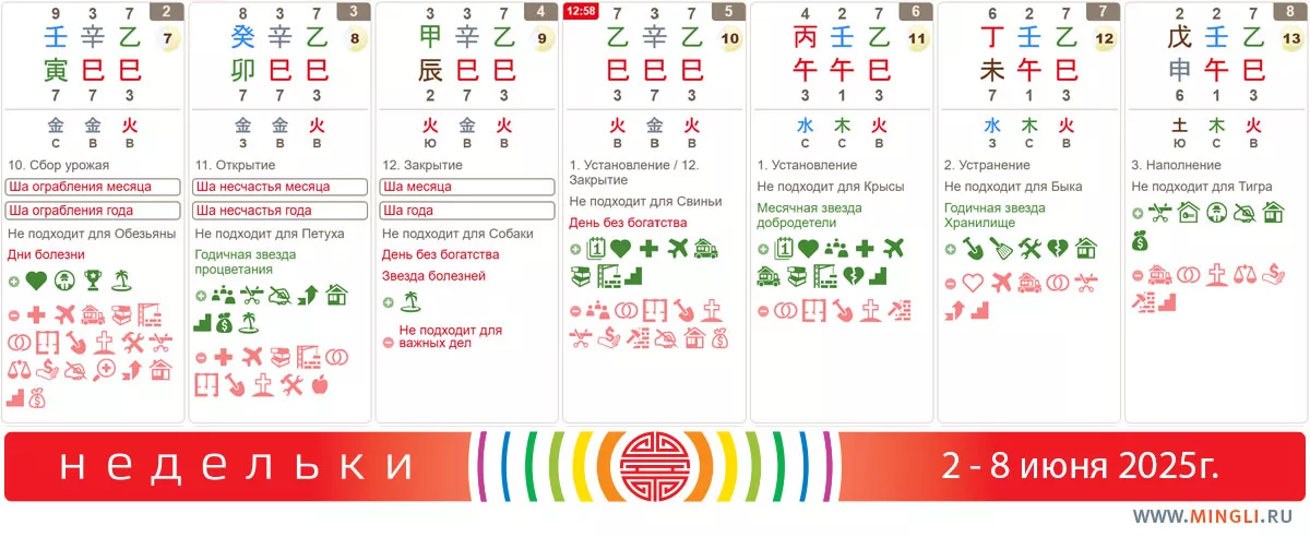 Здравствуйте, Мария! Спасибо за добрые слова 🙏😊 Важно избегать и быть предельно внимательными в те даты, когда столкновение собирается также и в самой дате: август месяц, дни тигра/обезьяны, часы тигра/обезьяны — для примера можно посмотреть в календаре час обезьяны 2 июня https://mingli.ru/calendar/02-06-2025 Такие моменты лучше провести максимально мирно.