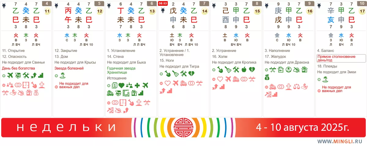 5 августа, вторник. Довольно сильный Огонь в этом дне, учитывая комбинацию Козы, Лошади и Змеи, может кому-то помочь, а кому-то – навредить, особенно если Огонь вреден карте бацзы с точки зрения здоровья. Звезда болезней советует нам беречь тело и не попадать в ситуации, в которых можно легко заразиться. Если Огонь полезен, и вы не Крыса – ловите свою удачу в час Козы, не глядя на индикатор Закрытие. С точки зрения Выбора дат дело, начатое в этот час, может принести отличные результаты! Конечно, в том случае, если окончания ретро-Меркурия вам никак не дождаться.