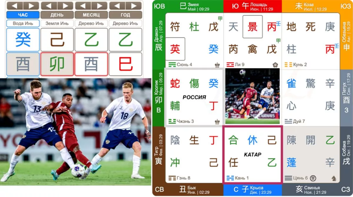 Сборная Катара на данный момент является  победитель Кубка Азии. В сборную России входят сильнейшие игроки клубов. Ну что ж, для меня же, как для прогнозиста — это реальный вызов попробовать спрогнозировать результат исхода игры. Поэтому накануне предстоящего матча, раскрыв карту Ци Мэнь, при ответе на вопрос «Какой будет результат матча Катар-Россия  на стадионе «Джассим Бин Хамад — Аль-Садд» в Эр-Райяне 7-го сентября?», вышел следующий расклад сил: