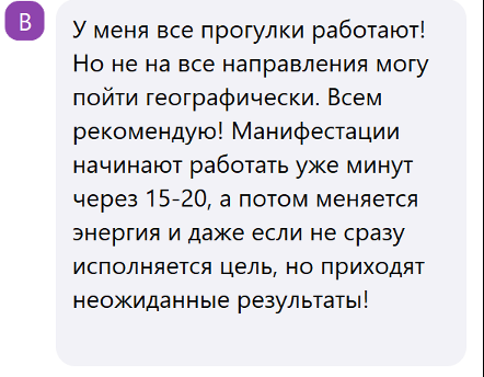 Гуляла в прогулки с группой единомышленников. Благодарю организаторов за эту возможность. Все объясняют, подробно и по делу, без лишней воды. Решила, что точно буду ходить, тк саму себя иногда сложно организовать. Результат от прогулок прекрасный. Прогулки учат обращать внимание на знаки пространства. Понимать какая цель важна, а какая второстепенна, и на чем нужно точно акцентировать свой запрос, что действительно нужно и важно именно в этот момент. Благодарю за такую возможность!